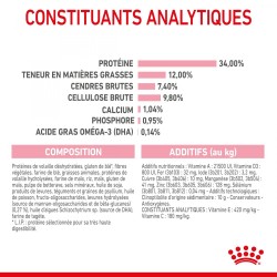 MENTIONS OBLIGATOIRES: COMPOSITION: protéines de volaille déshydratées, gluten de blé*, fibres végétales, farine de blé, graisses animales, protéines de volaille hydrolysées, farine de maïs, riz, maïs, gluten de maïs, pulpe de betterave, sels minéraux, huile de soja, produits de levures, téguments et graines de psyllium, huile de poisson, fructo-oligosaccharides, levures hydrolysées (source de mannan oligosaccharides et de bêta-glucanes) (0,27 %), huile d’algues Schizochytrium sp. (source de DHA), farine de tagète. * L.I.P.: protéine sélectionnée pour sa très haute digestibilité. ADDITIFS (AU KG): Additifs nutritionnels: Vitamine A: 21500 UI, Vitamine D3: 800 UI, Fer (3b103): 32 mg, Iode (3b201, 3b202): 3,2 mg, Cuivre (3b405, 3b406): 10 mg, Manganèse (3b502, 3b504): 41 mg, Zinc (3b603, 3b605, 3b606): 128 mg, Sélénium (3b801, 3b811, 3b812): 0,04 mg - Additifs technologiques: Clinoptilolite d’origine sédimentaire: 10 g - Conservateurs - Antioxygènes. CONSTITUANTS ANALYTIQUES: Protéine: 34 % - Teneur en matières grasses: 12 % - Cendres brutes: 7,4 % - Cellulose brute: 9,8 %