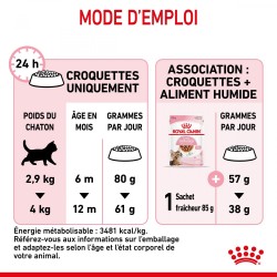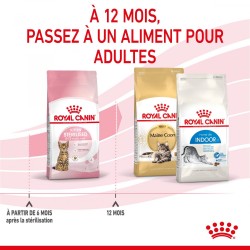 Chaton stérilisé de 6 mois à 12 mois .Aliment complet et équilibré spécialement élaboré pour le chaton stérilisé à partir de 6 mois jusqu'à 12 mois. Croissance et poids de forme Après la stérilisation, les besoins du chaton changent. KITTEN STERILISED l'aide à limiter la prise de poids grâce à une teneur adaptée en matières grasses et lui apporte le juste équilibre en nutriments (protéines, calcium, phosphore) pour une fin de croissance harmonieuse. Défenses naturelles Aide le chaton à soutenir ses défenses naturelles grâce à un complexe d'antioxydants et des prébiotiques. Santé digestive des protéines hautement digestibles (L.I.P) pour une bonne santé digestive et des prébiotiques pour l'équilibre de la flore intestinale.