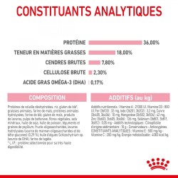 MENTIONS OBLIGATOIRES: COMPOSITION: protéines de volaille déshydratées, riz, gluten de blé*, graisses animales, farine de maïs, protéines animales hydrolysées, farine de blé, gluten de maïs, produits de levures, pulpe de betterave, fibres végétales, sels minéraux, huile de soja, huile de poisson, téguments et graines de psyllium, fructo-oligosaccharides, levures hydrolysées (source de mannan-oligosaccharides et de bêta-glucanes) (0,29 %), huile d’algues Schizochytrium sp. (source de DHA), farine de tagète. * L.I.P.: protéine sélectionnée pour sa très haute digestibili ADDITIFS (AU KG): Additifs nutritionnels: Vitamine A: 21000 UI, Vitamine D3: 800 UI, Fer (3b103): 32 mg, Iode (3b201, 3b202): 3,2 mg, Cuivre (3b405, 3b406): 10 mg, Manganèse (3b502, 3b504): 42 mg, Zinc (3b603, 3b605, 3b606): 126 mg, Sélénium (3b801, 3b811, 3b812): 0,05 mg - Additifs technologiques: Clinoptilolite d’originesédimentaire: 10 g - Conservateurs - Antioxygènes. CONSTITUANTS ANALYTIQUES: Protéine: 36 % - Teneur en matières grasses: 18 % - Cendres brutes: 7,8 % - Cellulose brute: 2,3 %