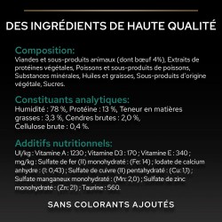 COMPOSITION: Viandes et sous-produits animaux (dont Boeuf 4%), Extraits de protéines végétales, Poissons et sous-produits de poissons, Substances minérales, Huiles et graisses, Sous-produits d'origine végétale, Sucres.