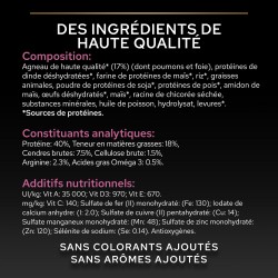 COMPOSITION: Agneau de haute qualité* (17%) (dont poumons et foie), Protéines de dinde déshydratées*, Farine de protéines de maïs*, Riz*, Graisses animales, Poudre de protéines de soja*, Protéines de pois*, Amidon de maïs, oeufs déshydratés*, Maïs*, Racine de chicorée séchée, Substances minérales, Huile de poisson, Hydrolysat, Levures*. *Sources de protéines.