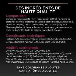 COMPOSITION: Canard de haute qualité (15%) (dont dos et coffre), Riz, Farine de protéines de maïs, Protéines de volaille déshydratées, Gluten de blé, Protéines de pois, Farine basse de blé, Foie de porc (4%), Maïs, Fibres végétales séchées, Substances minérales, Graisses animales, oeufs déshydratés, Huile de poisson, Hydrolysat, Levures.