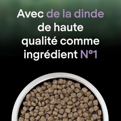 COMPOSITION: Dinde (14%), Protéines de volaille déshydratées, Farine de protéines de maïs, Riz, Farine de soja, Gluten de blé, Blé, Graisse de porc, Amidon de maïs, oeufs déshydratés, Farine basse de blé, Chicorée (2%), Substances minérales, Huile de soja, Cellulose, Huile de poisson, Hydrolysat, Poudre de jaune d'œuf (0,6%), Levures.