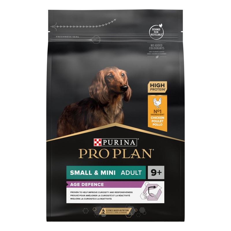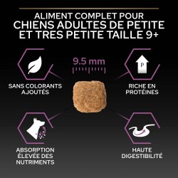 PURINA PRO PLAN Small & Mini Adult 9+ with OPTIAGE est une alimentation complète sous forme de croquettes contenant une combinaison de nutriments qui comprend des triglycérides à chaîne moyenne (TCM 5,5%).