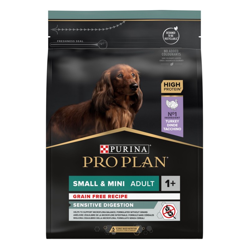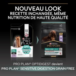 PURINA® PRO PLAN® Chien Small & Mini Adult Sensitive Digestion avec OPTIDIGEST formule sans céréales est un aliment hautement digestible, formulé sans céréales, il apporte tous les nutriments dont votre chien à la digestion sensible a besoin pour des bénéfices sur le long terme.