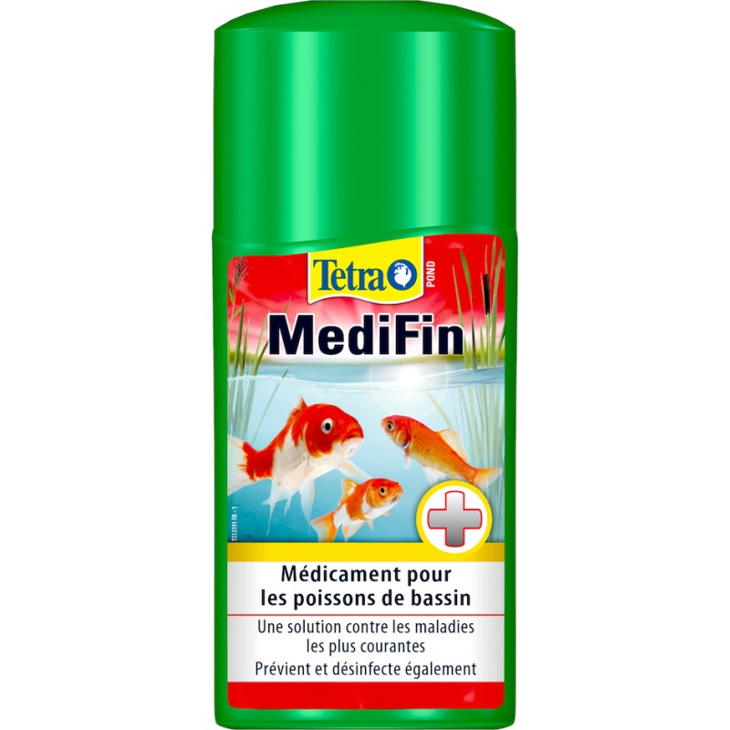 lnstructions de dosage/mode d'appllcation: Agitez vigoureusement le produit avant emploi. Ajoutez 50ml de solution Tetra Pond MediFin pour 1 000L d'eau&assurez-vous de répartir le produit uniformérnent dans l'eau du bassin. N'utilisez pas de clarificateur UV, résine synthétique ou charbon actif pour filtrer l'eau lors du traitement. Le cycle de traitement s'étend sur 4 à 7 jours&commence dès le jour où le dosage unique est administré. Le médicament agit au cours des jours qui suivent. Dans la mesure du possible, utilisez du charbon actif pour filtrer l'eau à la fin de chaque cycle de traitement. Le filtre ne doit pas etre trop encrassé. Nous recommandons de prévoir une aération supplémentaire. Un deuxième dosage peut etre ajouté au bassin une fois l'eau filtrée. Pour les bassins contaminés par la maladie des points blancs ou dont la température de l'eau est basse, il est recommandé d'effectuer au moins deux cycles de traitement consécutifs. Il est également recommandé d'utiliser le produit comme traitement préventif, en particulier après la période d'hibernation&lors de l'ajout de nouveaux poissons. Tetra Pond MediFin contient une combinaison d'ingrédients actifs conçue pour assurer un traitement à large spectre, couvrant une grande variété de maladies des poissons. Tetra Pond MediFin lutte contre les pathogènes bactériens¶sitaires&désinfecte l'eau des bassins de jardin. ll est essentiel de procéder au traitement le plus tôt possible, de sorte que les poissons gravement infectés ne soient pas trop affaiblis&puissent encore se rétablir. N'utilisez pas Tetra Pond MediFin en association avec d'autres médicaments. ll peut cependant être utilisé conjointement avec d'autres produits TetraPond. Protégez le produit du rayonnement solaire. Stockez-le dans son emballage d'origine, à une température maximale de 25°C.