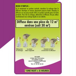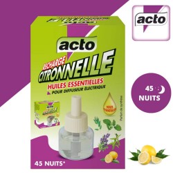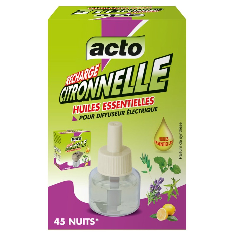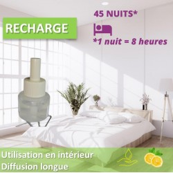 • Agréablement parfumé à la citronnelle et aux huiles essentielles de citron, romarin, lavande et eucalyptus. • Utilisation en intérieur. • Se branche sur secteur. • Diffusion longue durée, une recharge dure 45 nuits (1 nuit = 8 heures).