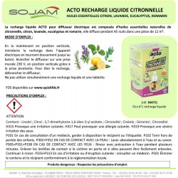 MENTIONS OBLIGATOIRES: Avant toute utilisation, lisez l'étiquette et les informations concernant le produit. Produits dangereux : respectez les précautions d'emploi. ATTENTION Contient : Linalol Citral 3,7-dimethylocta-1,6-dien-3-yl acétate Citronellal Cinéole Géraniol Citronellol.H315 Provoque une irritation cutanée. H317 Peut provoquer une allergie cutanée. H319 Provoque une sévère irritation des yeux.P101 En cas de consultation d'un médecin, garder à disposition le récipient ou l'étiquette. P102 Tenir hors de portée des enfants. P302+P352 EN CAS DE CONTACT AVEC LA PEAU : Laver abondamment à l'eau et au savon.P305+P351+P338 EN CAS DE CONTACT AVEC LES YEUX : Rincer avec précaution à l'eau pendant plusieurs minutes. Enlever les lentilles de contact si la victime en porte et si elles peuvent être facilement enlevées. Continuer à rincer. P333+P313 En cas d'irritation ou d'éruption cutanée : consulter un médecin. P501 Éliminer le contenu et le récipient conformément à la réglementation locale.