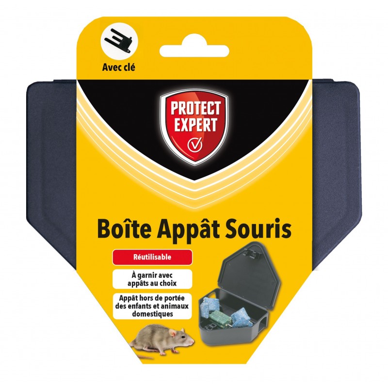 Boîte d'appâtage souris à double entrée, sécurisée avec clé. A garnir de pâtes, blocs ou céréales. Permet d'appâter en limitant les risques d'ingestion par les enfants et les animaux domestiques.