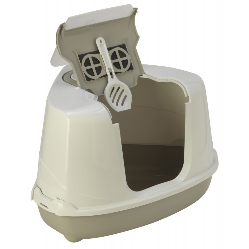 Bac à litière d'angle plastique avec poignée. Fourni avec porte d'accès amovible, pelle et filtre charbon. Fermeture rapide grâce à ses clips plastique permettant de soulever le capot en quelques secondes !!!!! Son large espace intérieur permet à votre compagnon de s'y déplacer plus aisément. Dimensions Largeur 56 cm x Profondeur 45 cm. Hauteur 39 cm