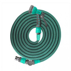 Il est compose d'un tuyau etirable / retractable de 7,5 a 22,5 metres, d'un pistolet 7 jets, d'un raccord articule 180° cote robinet , d'un raccord rapide de l'autre, d'un nez de robinet 15x21- 20x27 et d'une boite de rangement. existe en 2 coloris : vert anis et turquoise. leger et facile a ranger, il ne fait pas de noeud et ne s'entortille pas. pression d'utilisation 2 a 4 bars. apres utilisation : fermer le robinet et vider toujours l'eau du tuyau